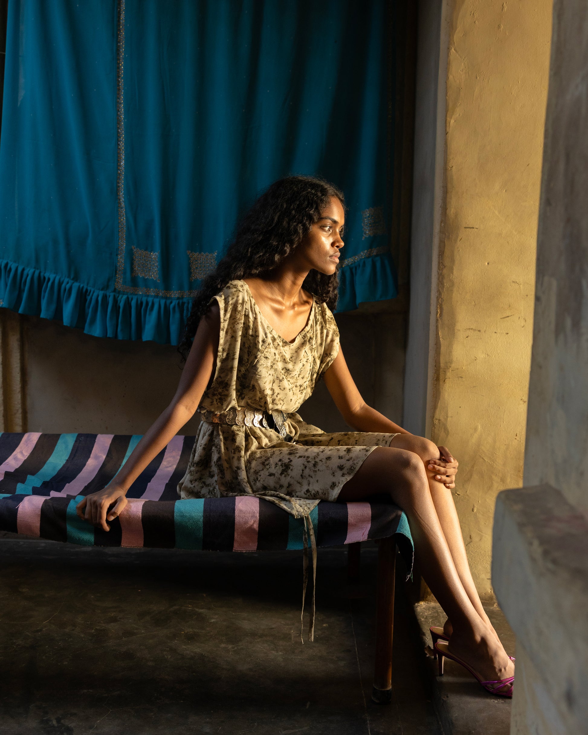 The Tali Dress is flirty and fun, with draw strings down the front she can be worn as a mini dress or as a top over trousers. Made in georgette silk and naturally dyed with marigold to create a deep green colour.